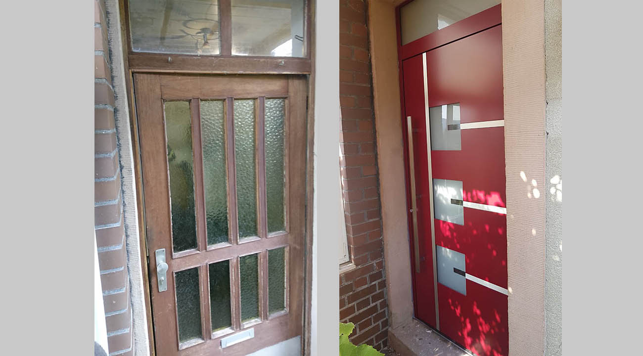 Ausgeführte Arbeiten: Aufmaß, Demontage der vorhandenen Türelemente, Entsorgung, Lieferung und Montage der neuen Tür, Verleistung und Versiegelung. Die Fotos links zeigen den ursprünglichen Zustand des Gebäudes. Auf den Fotos rechts sehen Sie die neue Ansicht nach dem Austausch der jeweiligen Haustüranlage.